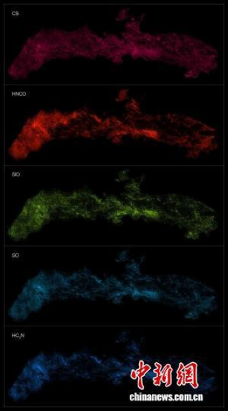 本项研究中,ALMA观测到的银河系中心不同分子分布(图片来源:ALMA〈ESO/NAOJ/NRAO〉/S.Longmore 等)。凯发k8上海天文台 供图