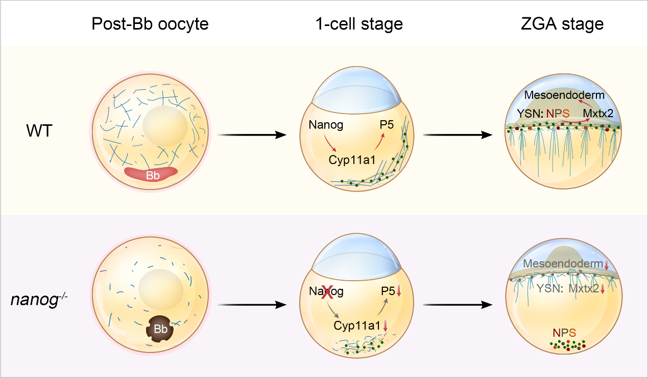 进一步研究发现,在卵子发生和早期胚胎胚外组织中,均存在一个Nanog–cyp11a1–P5轴。在卵子发生阶段,Nanog激活胆固醇侧链裂解酶编码基因cyp11a1的转录,促进卵子中胆固醇向P5的转换、微管组装、卵子成熟和卵子质量,进而促进早期受精胚卵黄胞质层中,微管的组装和母源物质向动物极的运输。