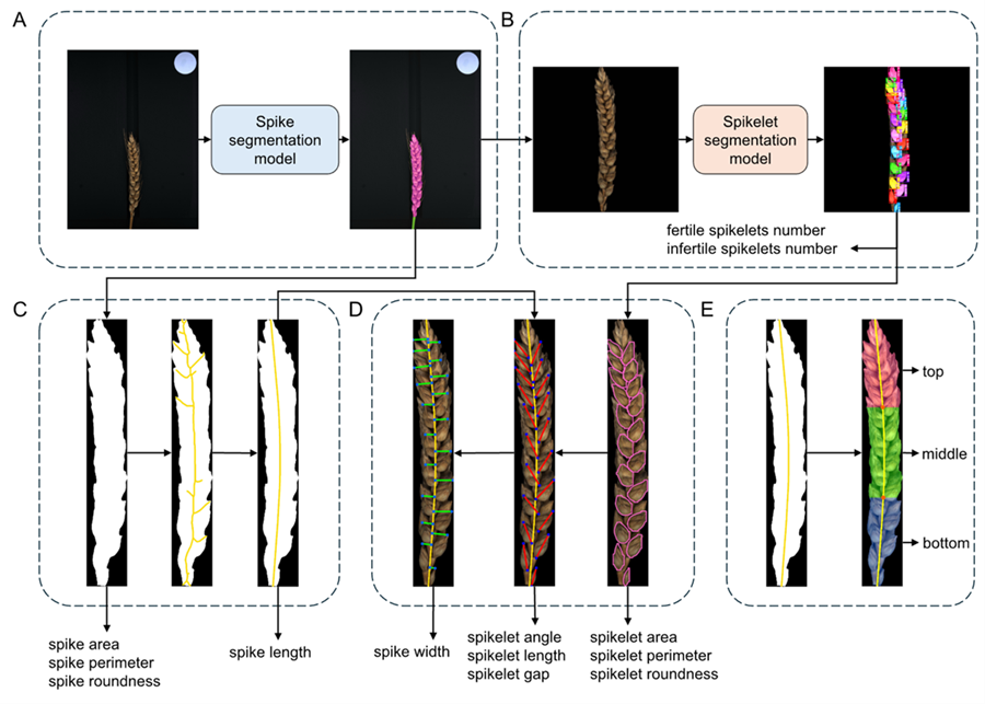 小麦是全球最重要的粮食作物之一,提高产量对保障粮食安全至关重要。小麦产量主要由穗数、穗粒数和千粒重决定,但三者之间往往存在拮抗作用,难以同时提高,解析穗部结构特征对于揭示产量形成机制具有重要意义。然而,传统的人工测量方法效率低、误差大,难以获取复杂而精细的穗部表型信息。尽管近年来影像分析与深度学习被引入麦穗表型研究,但现有方法仍没法对穗部复杂表型的系统性精准量化。因此,开发一种高效、准确、自动化、且精细化的穗部表型分析方法,对小麦遗传改良和高产育种具有重要意义。