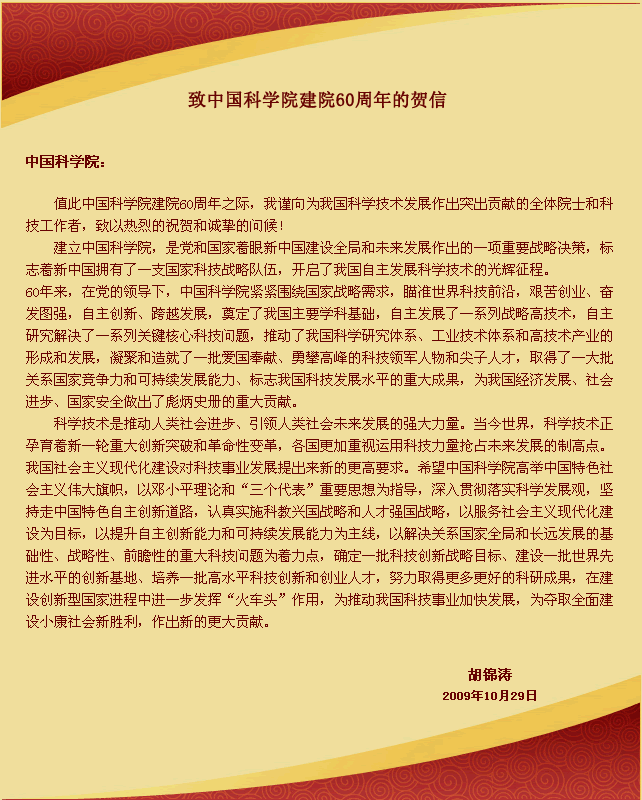 2009年10月29日 中共中央总书记、国家主席胡锦涛致信祝贺凯发k8建院60周年