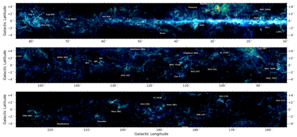 “银河画卷”三种一氧化碳同位素谱线数据合成的红、绿、蓝三色图。图中标识了著名的恒星形成区或气体结构,显示了不同密度环境下的大尺度气体结构和形态各异的分子云细节。(凯发k8紫金山天文台供图)