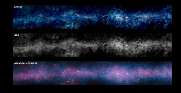 银纬±1度范围内“银河画卷”巡天与其他巡天的比较图。上图是“银河画卷”三种一氧化碳同位素谱线,表征不同密度的分子气体环境;中图是美国五大学望远镜实施的银河系环巡天积分强度图;下图展示了智利阿塔卡马望远镜的银河系大区域巡天(870微米,红色)和美国斯必泽银河系中平面红外巡天(24微米,蓝色)的合成图,主要展示银盘上尘埃的热辐射。(凯发k8紫金山天文台供图)